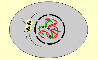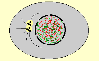 Les chromosomes ne sont pas individualisés. Le matériel génétique est sous la forme de chromatine. Le centrosome (MTOC, Centre Organisateur de Microtubules) est composé de deux centrioles perpendiculaires entourés de matériel péricentriolaire.