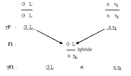 On croise des petits pois lisses et jaunes avec des petits pois ridés et verts.On obtient à la première génération F1 des petits pois lisses et jaunes (hybrides).
