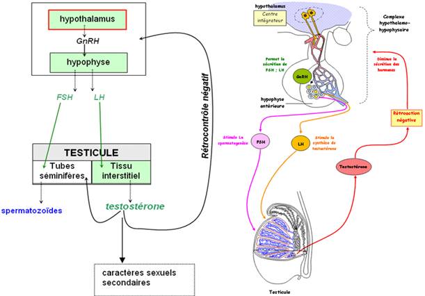 Des neurones hypothalamiques sécrètent de neurohormone appelée GnRH (Gonadotrophine Releasing Hormon ou gonadolibérine), déversée dans les capillaires sanguins au niveau de la tige hypophysaire ou pituitaire et transportée aux cellules de l’antéhypophyse. Ces dernières vont produire de FSH et LH hypophysaires, agissant sur les testicules pour la spermatogenèse et la production de testostérone.