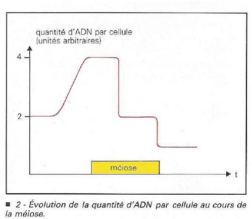 4 - L'analyse du graphe concernant l'évolution de la quantité d'ADN par cellule au cours de la méiose permet de replacer cette évolution par rapport aux deux divisions qui constituent la méiose et de mieux appréhender le comportement des chromosomes, lors de ce phénomène.