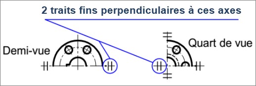 Pour simplifier ou gagner de la place dans la zone de dessin pour une vue comportant des axe de symétrie, on peut faire une représentation par une fraction de vue. Repérer les extrémités des axes de symétrie par deux petits traits fins perpendiculaires à ces axes.