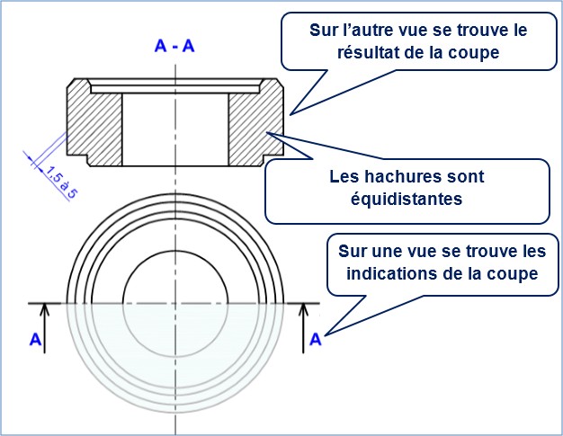 La coupe a pour but de rendre le dessin plus clair en remplaçant les contours cachés des pièces creuses (trait interrompu fin) par des contours vues (trait fort).