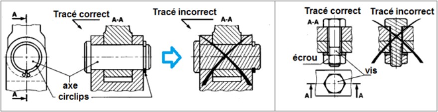 Par convention, on ne coupe jamais les pièces pleines de révolution (arbre ou axe, vis, clavette, rivets) ni les nervures : une coupe n'apporte aucune information et alourdit le dessin, donc nuit à sa lisibilité.