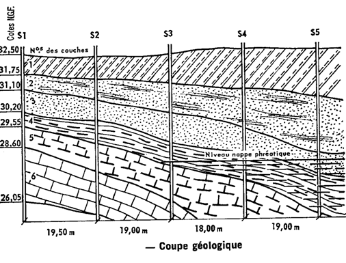 D’habitude, un seul relevé de sondage ne donne aucune idée de l’étendue des diverses couches, mais par recoupement de divers forages alignés et assez rapprochés, on peut dresser une coupe géologique, véritable section du sol selon un plan sécant vertical, avec les indications suivantes: