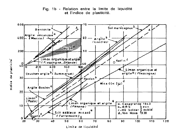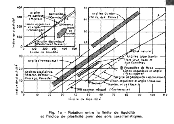 C'est en se basant sur les graphiques de la figure 1 que Casagrande a établi le diagramme de plasticité de la figure 2 qui sera utilisé pour classer les sols plastiques.