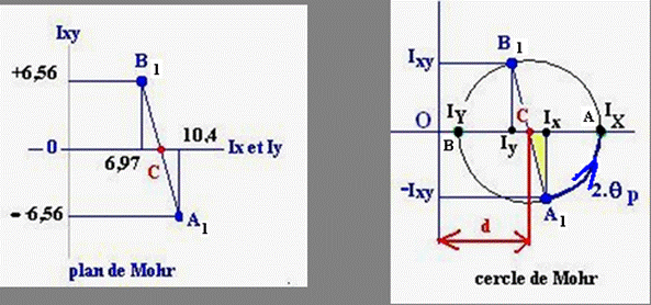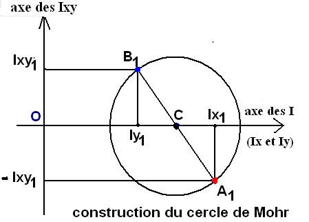 A ces 3 grandeurs d’inertie calculées auparavant correspondent deux points A1 et B1 du repère de Mohr de coordonnées A1(Ix1,Ix1y1) et B1 (Iy1, -Ix1Iy1).