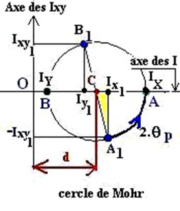 Pour que Ix et Iy deviennent IX et IY (moments principaux), le diamètre A1B1 doit tourner de 2qP dans le sens trigonométrique sur le cercle et se confondre avec AB sur l’axe des abscisses.