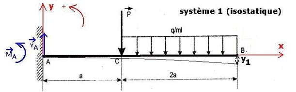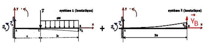 Le système étudié peut être considéré comme la superposition de 2 systèmes en équilibre ; le système 1 (poutre console libérée de l’appui B) et le système 2(poutre console soumise à la force YB seule).Voir schémas ci-dessous. Les systèmes 1 et 2 sont isostatiques et peuvent être résolus par les seules équations d’équilibre de la statique.