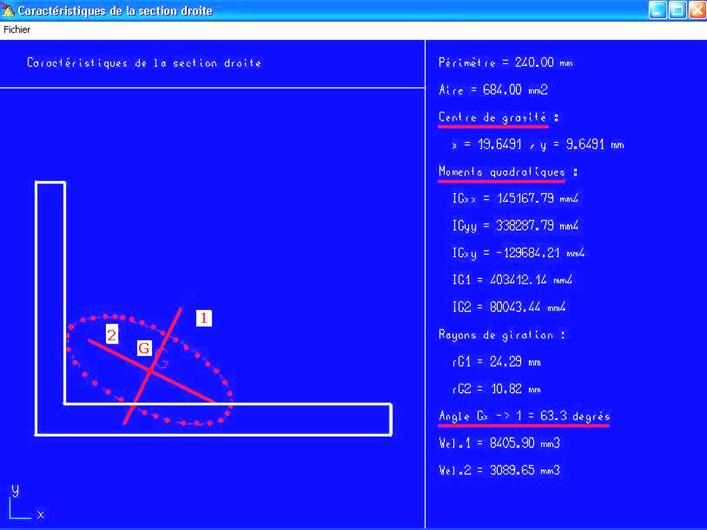 Demander au logiciel les caractéristiques d’une section de cornière inégale 70x50x6 .Celles-ci ont déjà été déterminées manuellement lors d’un exercice de synthèse précédent. Il faut considérer que les calculs manuels sont nécessaires à notre niveau d’étude pour effectuer un apprentissage correct des notions de base de RDM. Utiliser directement un logiciel comporte le risque de mal assimiler le cours. Dans notre cas le logiciel permettra de vérifier l’exactitude des calculs manuels.