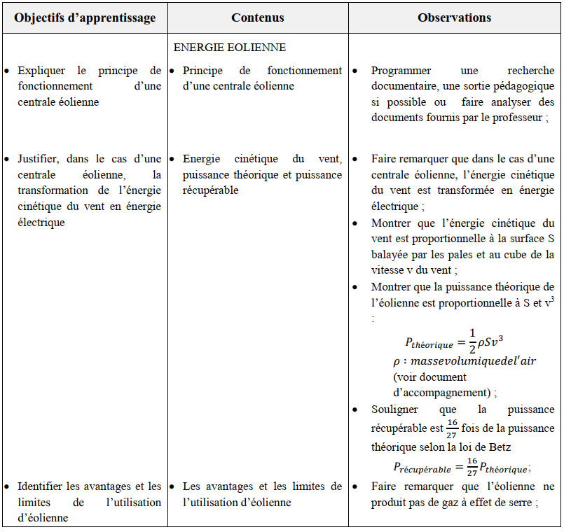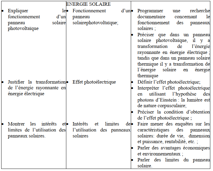 Objectifs généraux : L’apprenant est capable d’ :- expliquer l’importance des énergies renouvelables afin de contribuer au développement durable;