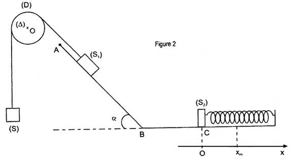 passant par son centre O (figure 2). On enroule sue le disque (D) un fil inextensible dont l’une de ses extrémité est liée à une solide (S) de masse m = 100g. L’autre extrémité est liée à un solide