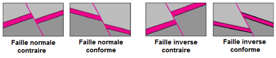 - Si le pendage des couches et du plan de faille va dans le même sens, la faille est conforme. Lorsque le pendage est inverse, on parle de faille contraire.