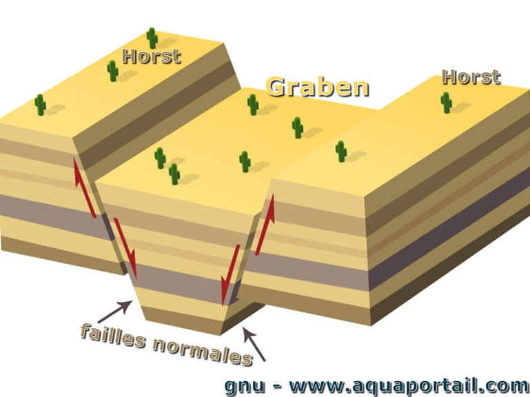 Lors d’un mouvement de distension, les failles normales sont associées pour délimiter des fossés défondrements appélés GRABENS, et séparés par des seuils ou HORSTS.
