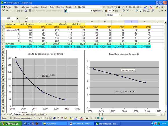 Faire des comptages tous les 10 ans jusque l’an 2100 environ, saisir les mesures au fur et à mesure dans un tableau préparé dans le document Excel « cesium.xls ».(voir document ci-dessus )