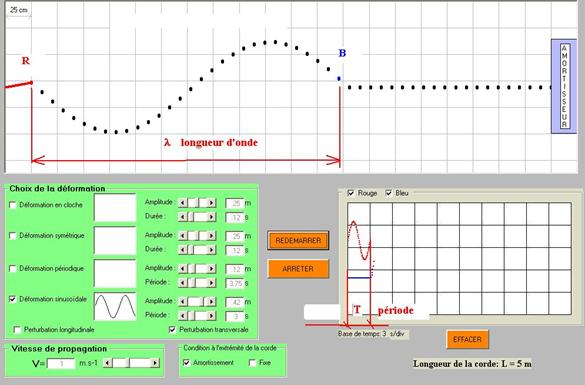 inférieure gauche permet de choisir tous les paramètres de l’onde : type de déformation (transversale ou longitudinale) ; amplitude qui reste constante lors de