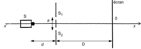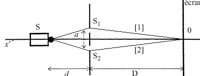 Le dispositif comprend une plaque percée de deux trous de Young distants de a =500 µ m. En utilisant comme source émettrice S un laser He-Ne, de longueur d’onde l= 633 nm on produit des interférences sur un écran. La plaque est placée à une distance d =20 cm de la source, l’écran à une distance D = 4 m de la plaque. Les deux trous de même diamètre sont placés à égale distance de la source et se comportent comme deux sources synchrones et cohérentes.