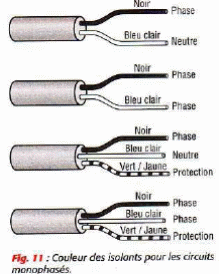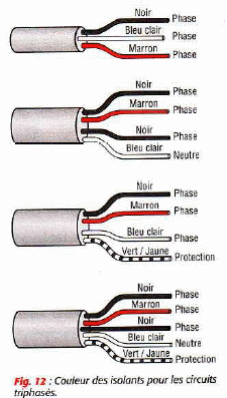 Les conducteurs de phases sont repérés par la couleur noire ou brune et éventuellement bleu clair dans les câbles triphasés sans neutre.